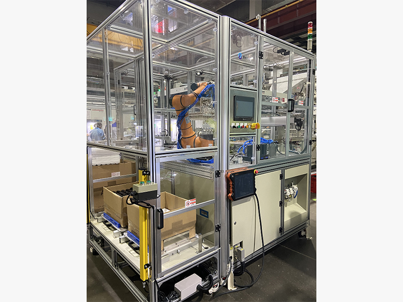 Robot automatic packing: The injection molded parts cut from the injection molding machine are transported and variable in distance, and are grabbed by the module mechanical arm in a single row onto the pallet. Then, a collaborative robot grabs the entire pallet onto the corrugated board inside the cardboard box. The corrugated board in the product compartment is also automatically picked up and placed by the collaborative robot