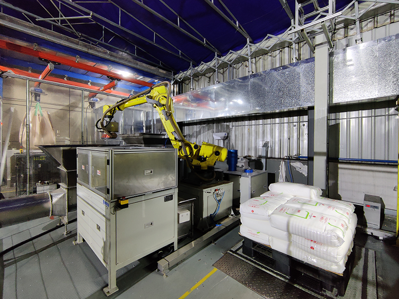 六轴机器人在3D视觉相机的引导下,抓取25公斤小料包,先到除尘工位除尘,然后在到料仓上方的进行袋子切割,机器人吸住空袋抖动粒子,让粒子全部倒出,然后让空袋放到废袋收集器上方